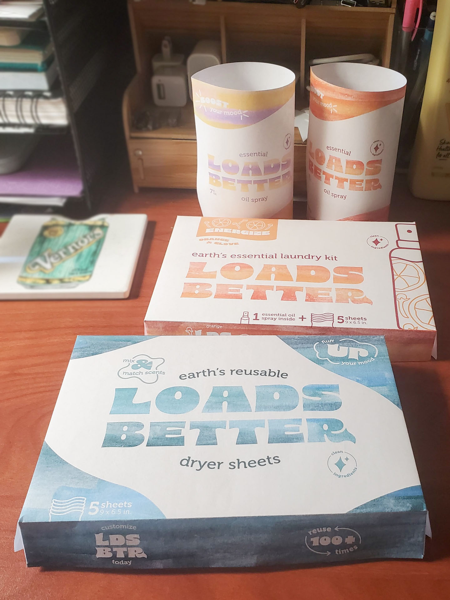 Design a series of three different packages that portray the ease and simplicity of Loads Better reusable dryer sheets.