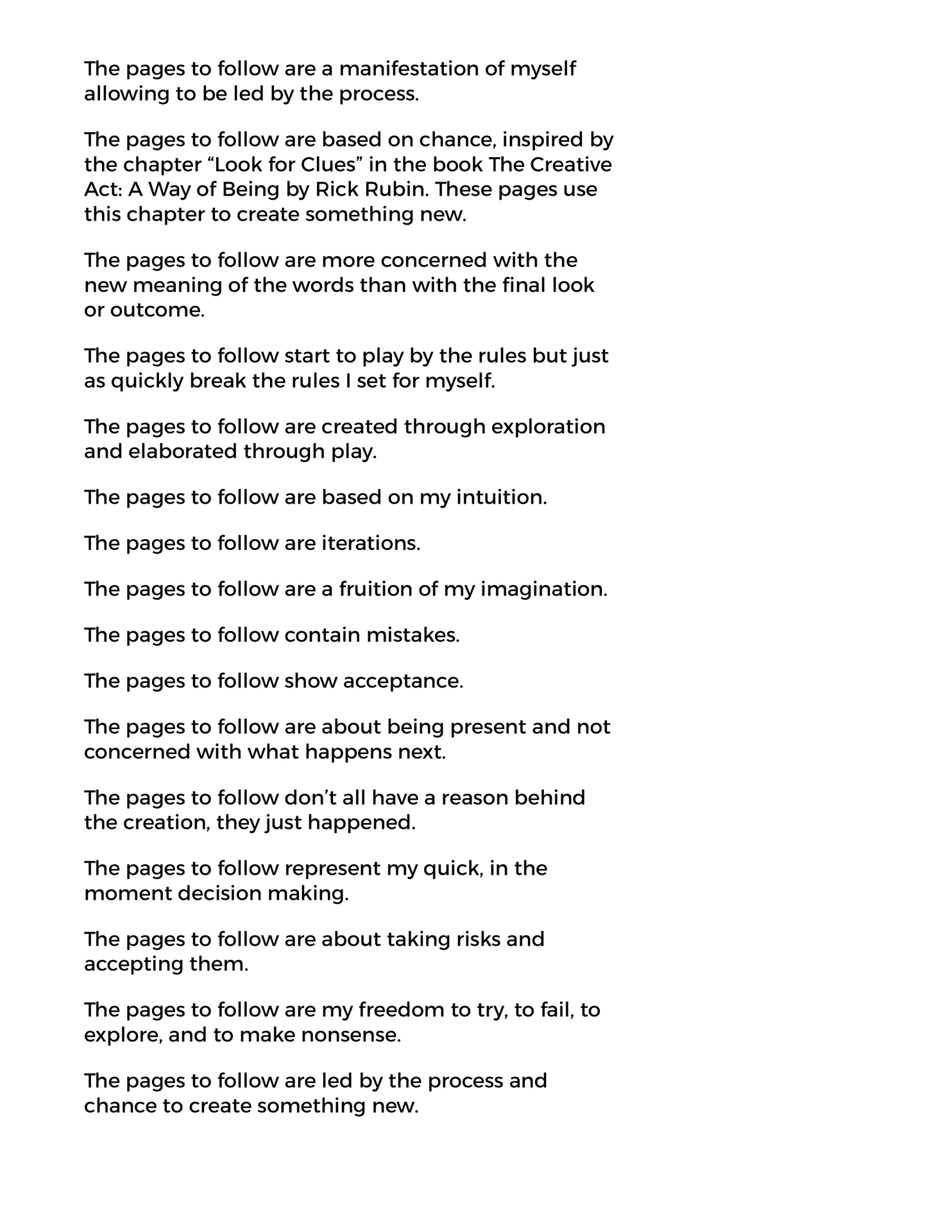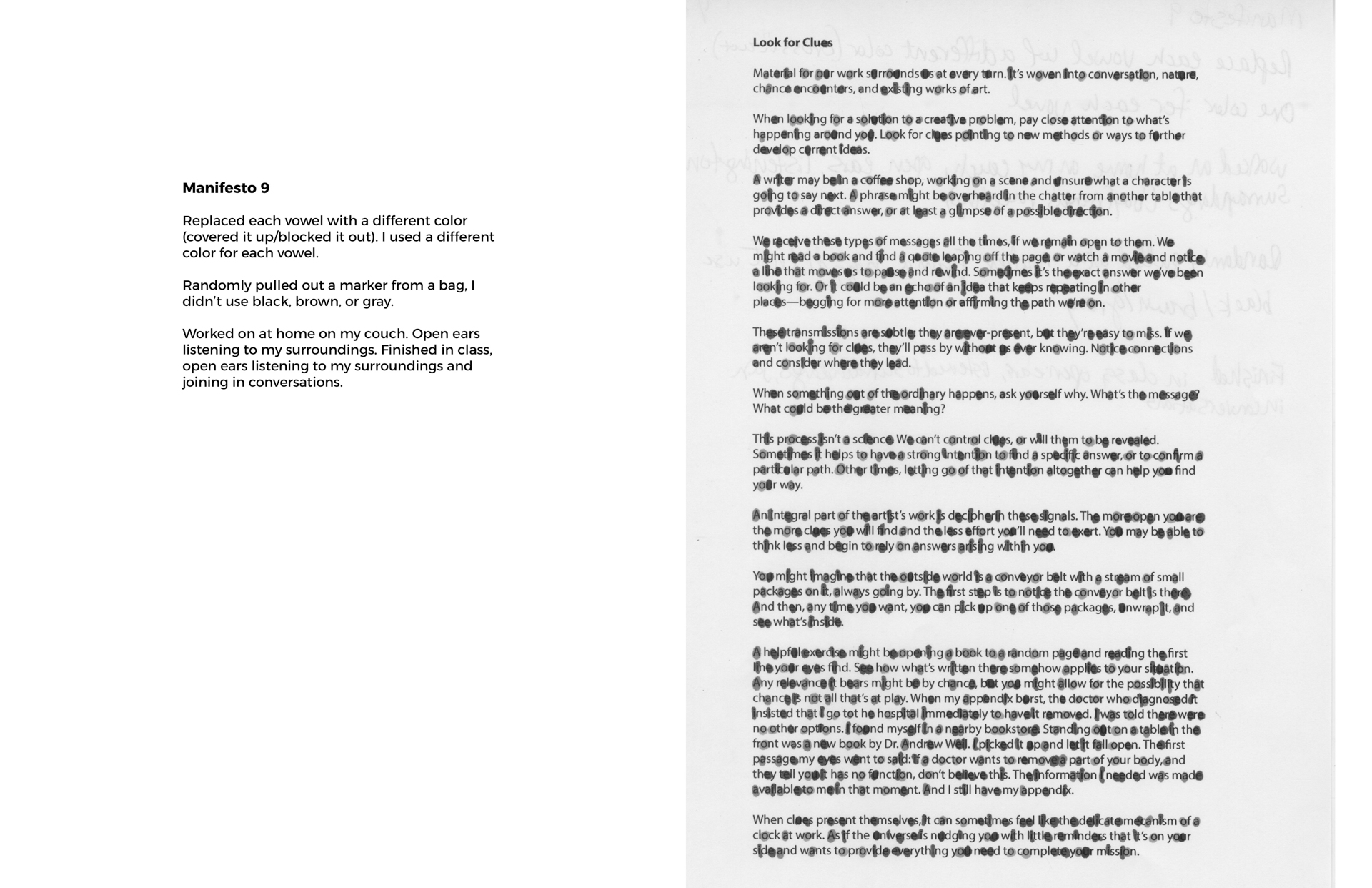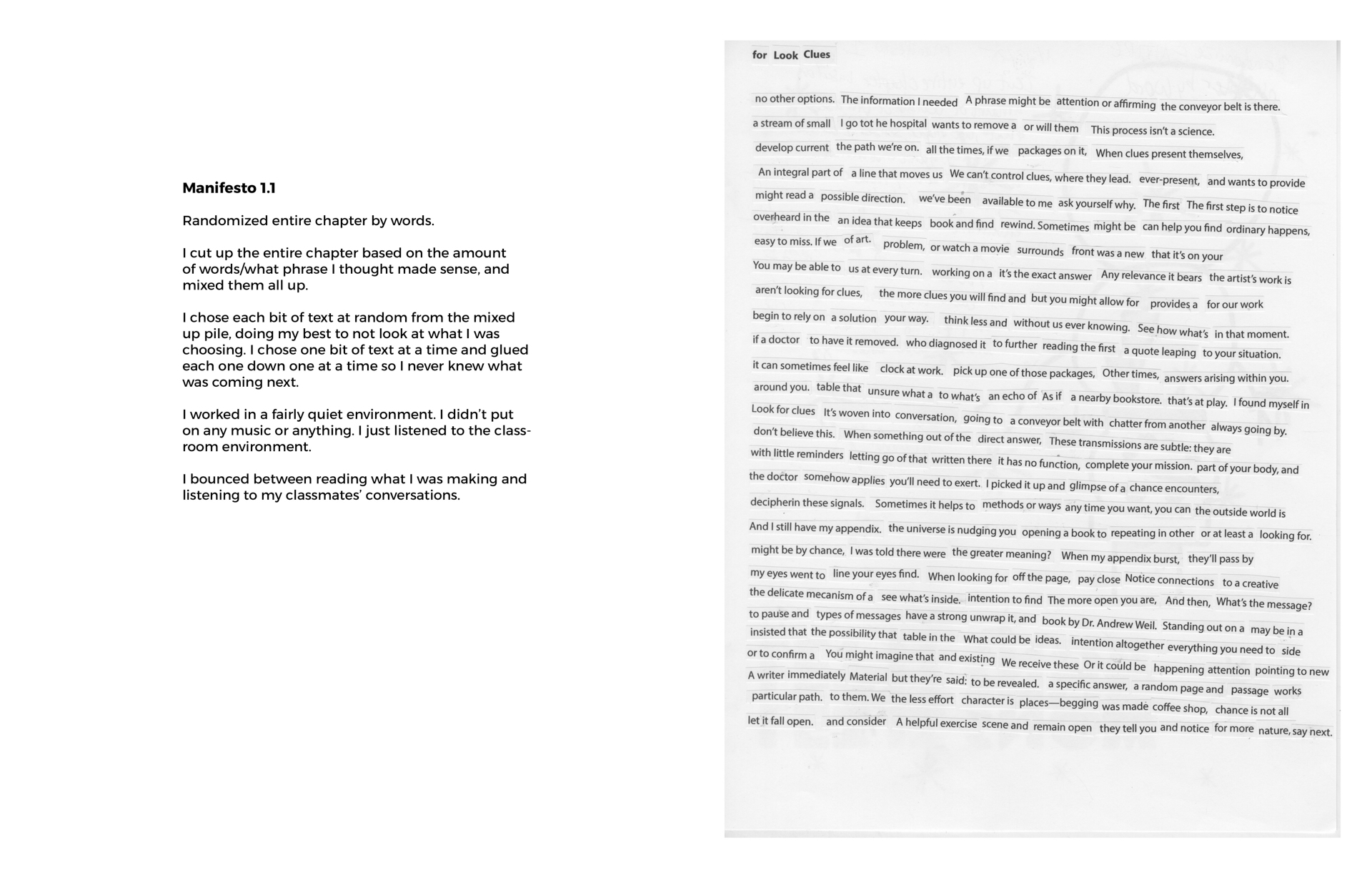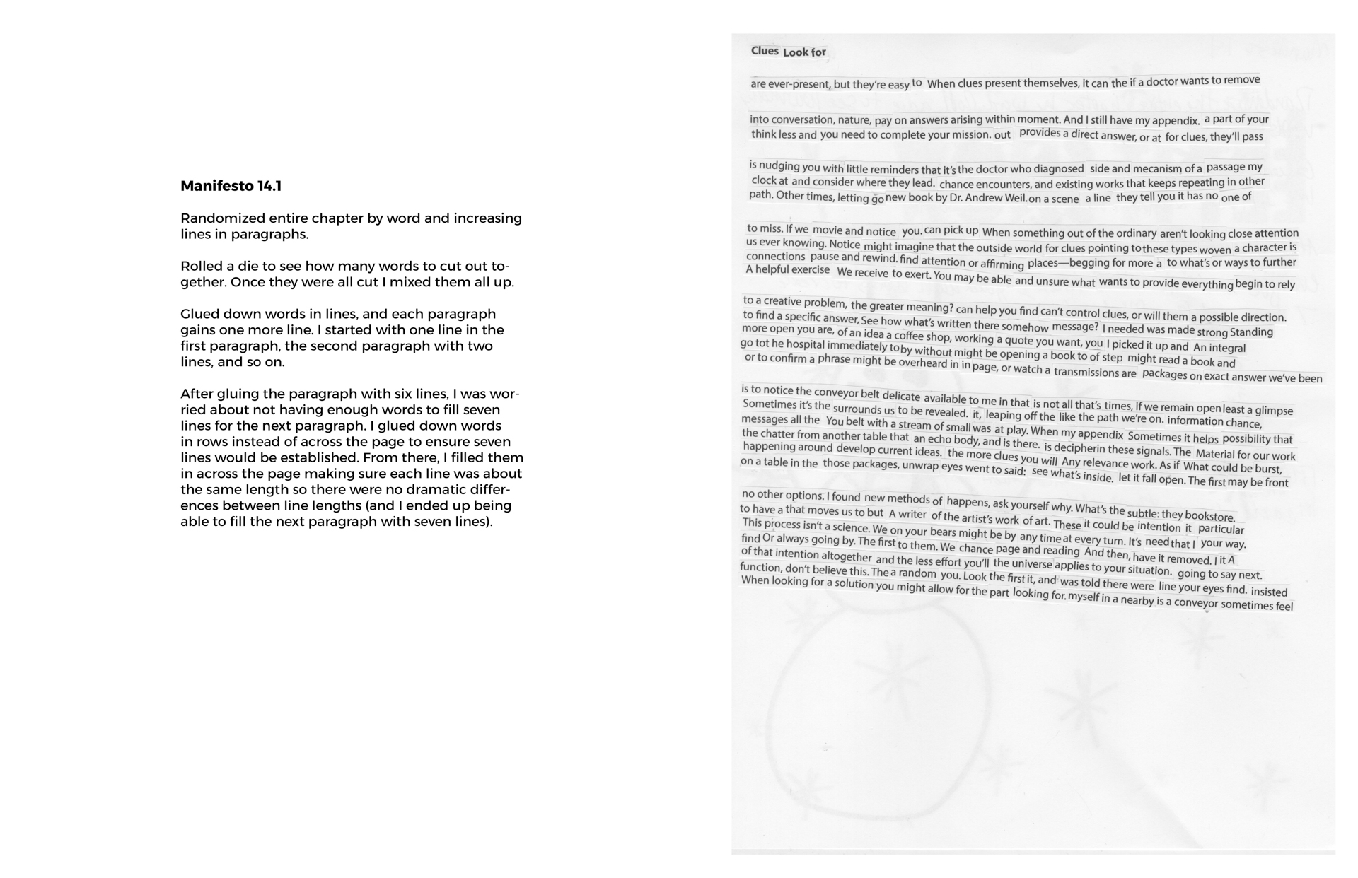 Take A Chance is a compendium of what happened when I let the act of process lead me. This manifesto was inspired by the chapter “Look for Clues” in the book The Creative Act: A Way of Being by Rick Rubin. The chapter discusses keeping an eye out for subtle messages throughout your day-to-day life that directly relate to you. I used the text from “Look for Clues” as my content, dismantled it, and used chance to piece it back together. I utilized a range of methods to reassemble the chapter, creating new meanings each time. Within each new narrative brings new meanings and clues.
