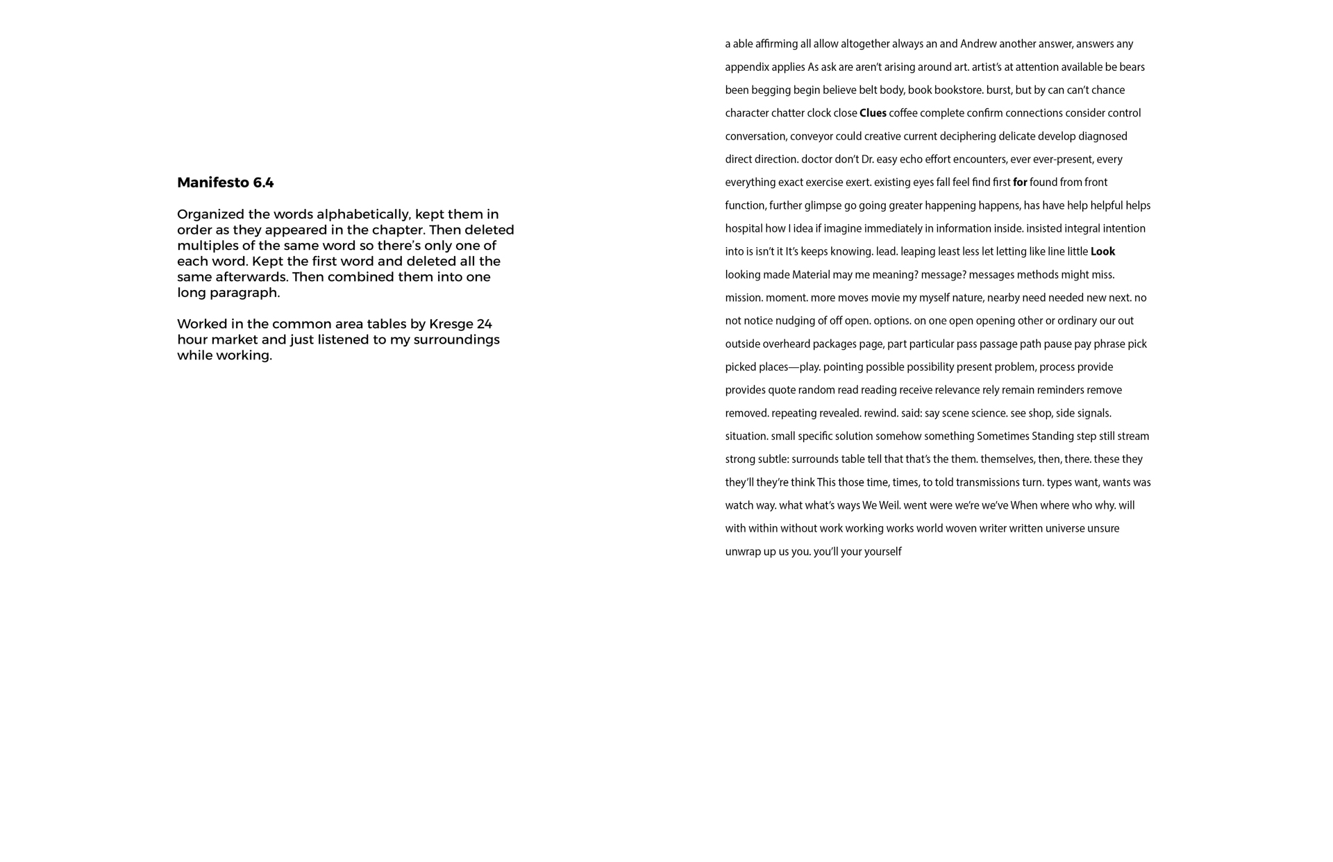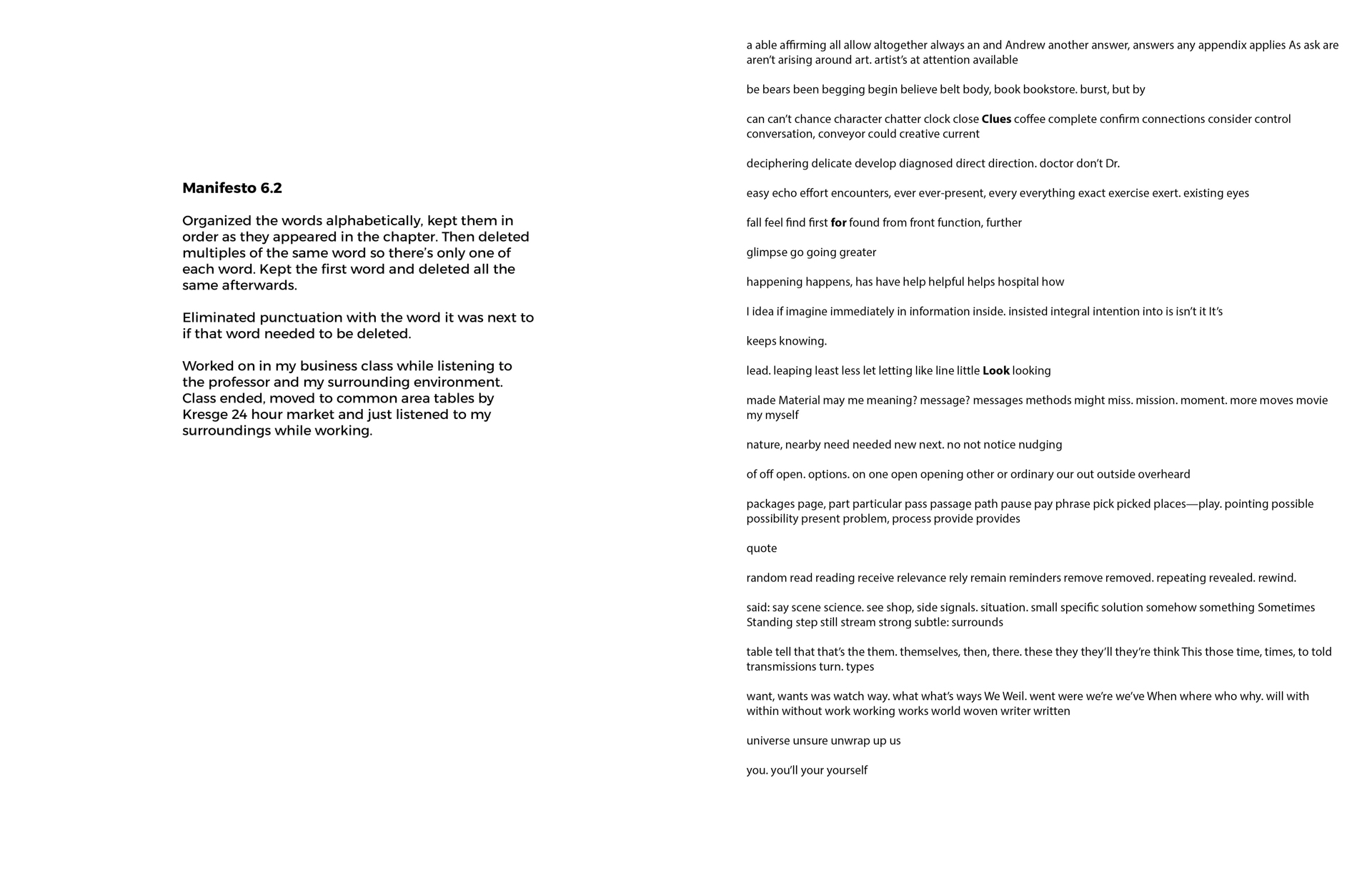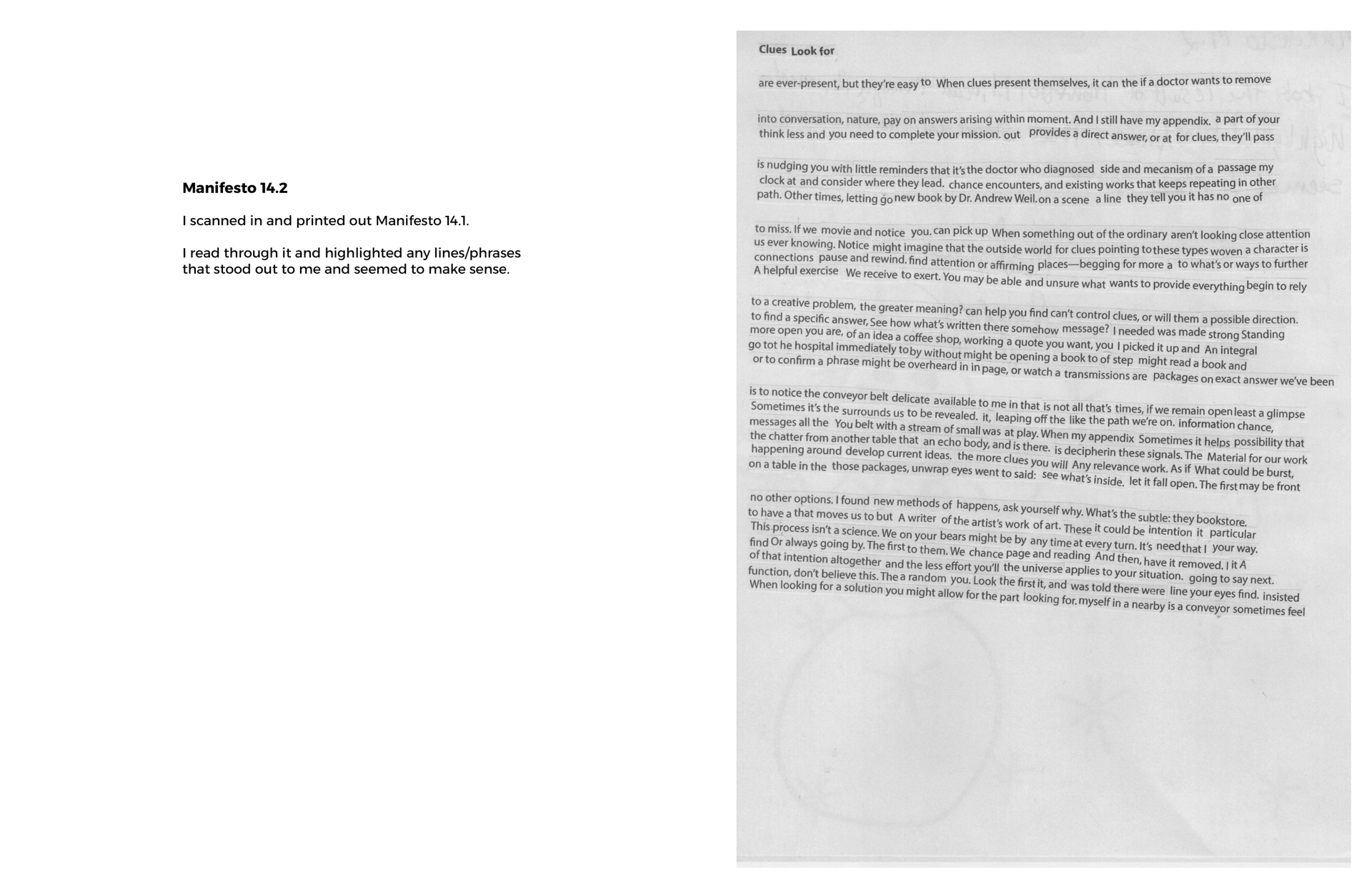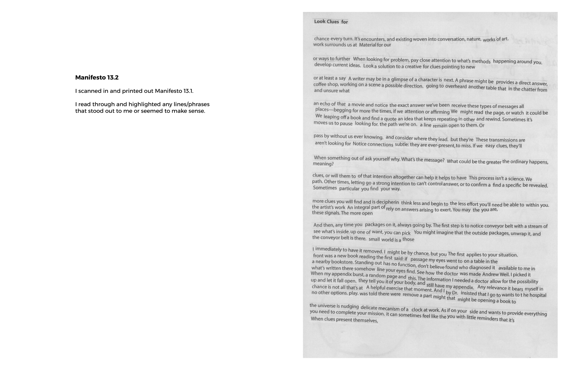 Take A Chance is a compendium of what happened when I let the act of process lead me. This manifesto was inspired by the chapter “Look for Clues” in the book The Creative Act: A Way of Being by Rick Rubin. The chapter discusses keeping an eye out for subtle messages throughout your day-to-day life that directly relate to you. I used the text from “Look for Clues” as my content, dismantled it, and used chance to piece it back together. I utilized a range of methods to reassemble the chapter, creating new meanings each time. Within each new narrative brings new meanings and clues.