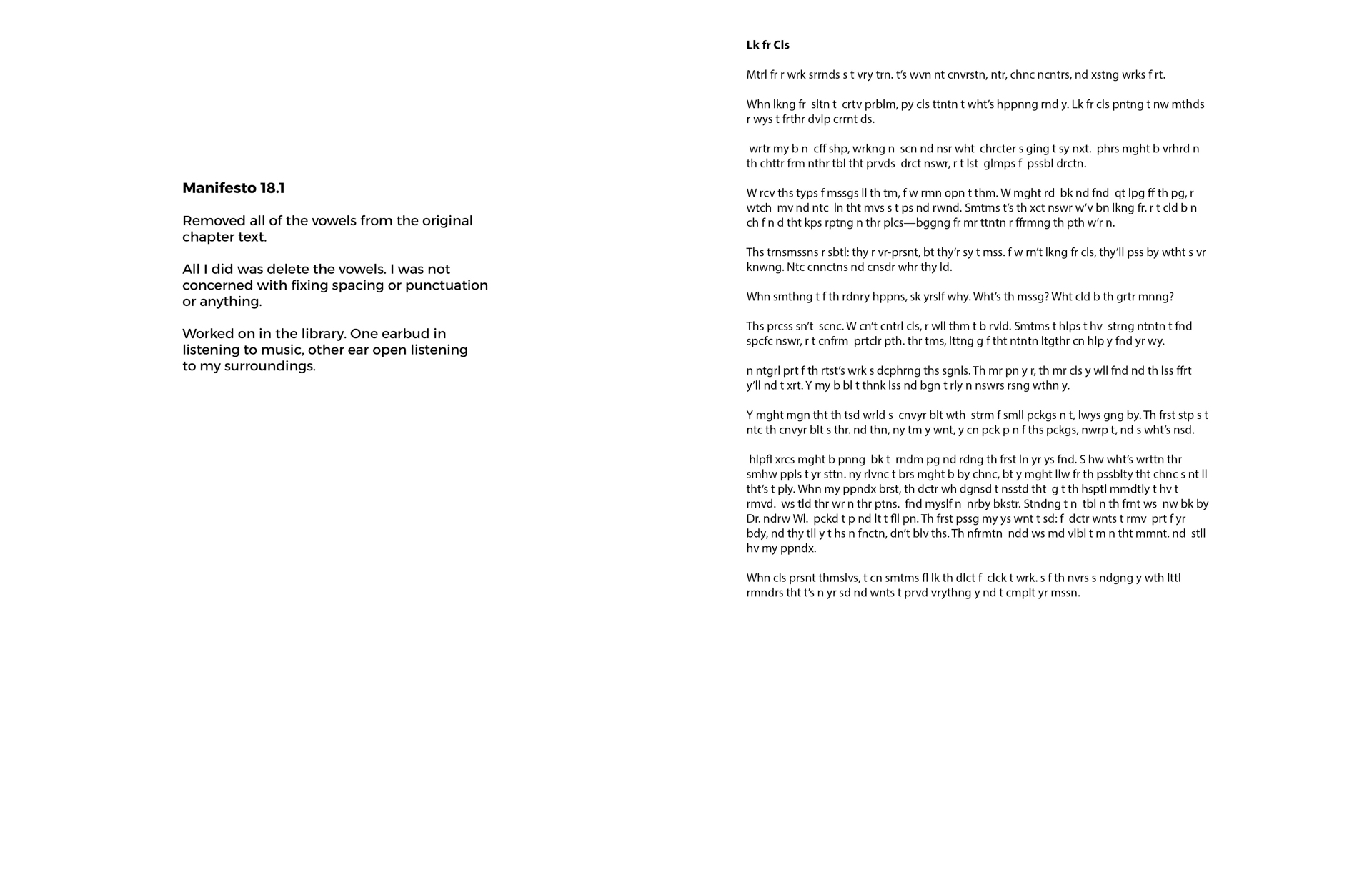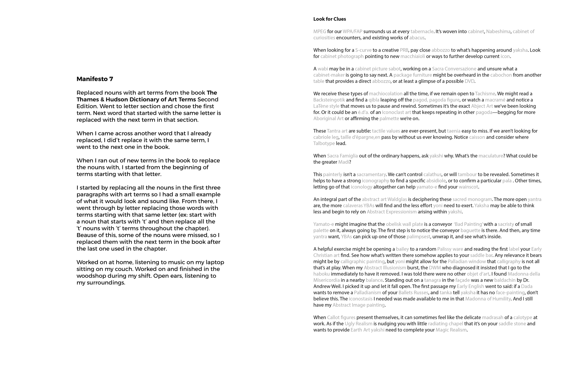 I was also inspired by Oulipo, a group of French mathematicians and writers who created new works using a series of writing constraints. Their most known technique is N+7, where they would replace every noun in a piece of writing with the seventh noun after it in the dictionary. N+7 was my starting point, and I escalated from there. Most of the constraints I used, I made up, some on the spot, others were planned. With each iteration I made, I became inspired to try new things. I kept asking myself what if I did this…?